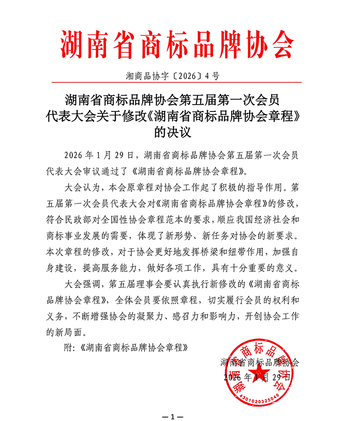 湖南省商标品牌协会第五届第一次会员代表大会关于修改《湖南省商标品牌协会章程》 的决议
