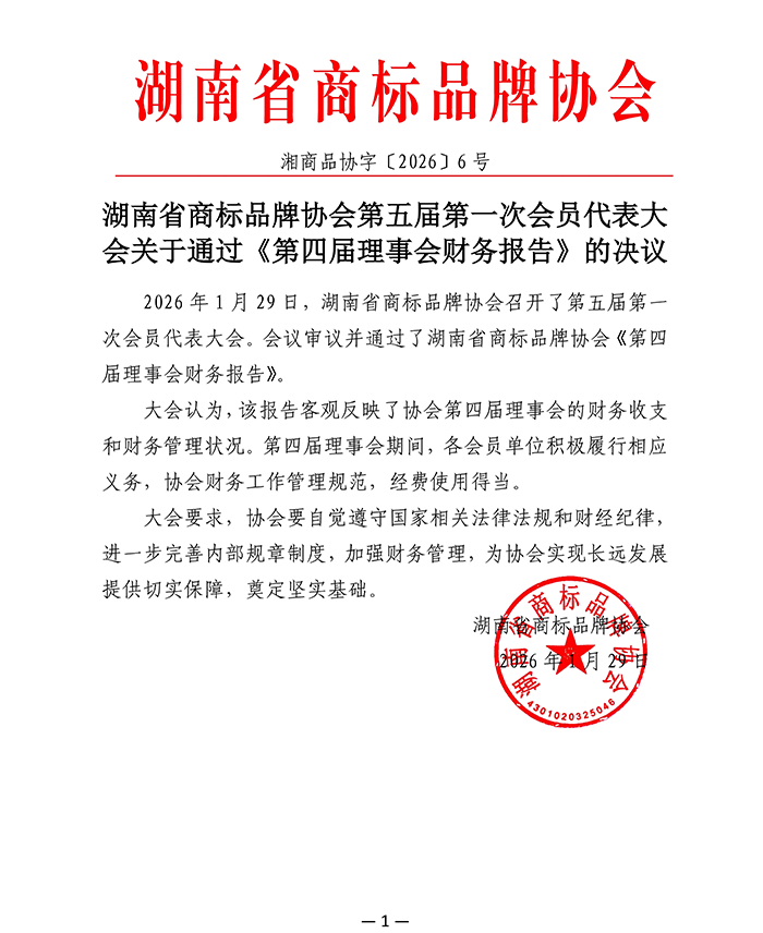 湖南省商标品牌协会第五届第一次会员代表大会关于通过《第四届理事会财务报告》的决议
