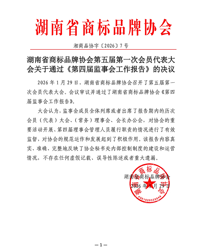 湖南省商标品牌协会第五届第一次会员代表大会关于通过《第四届监事会工作报告》的决议